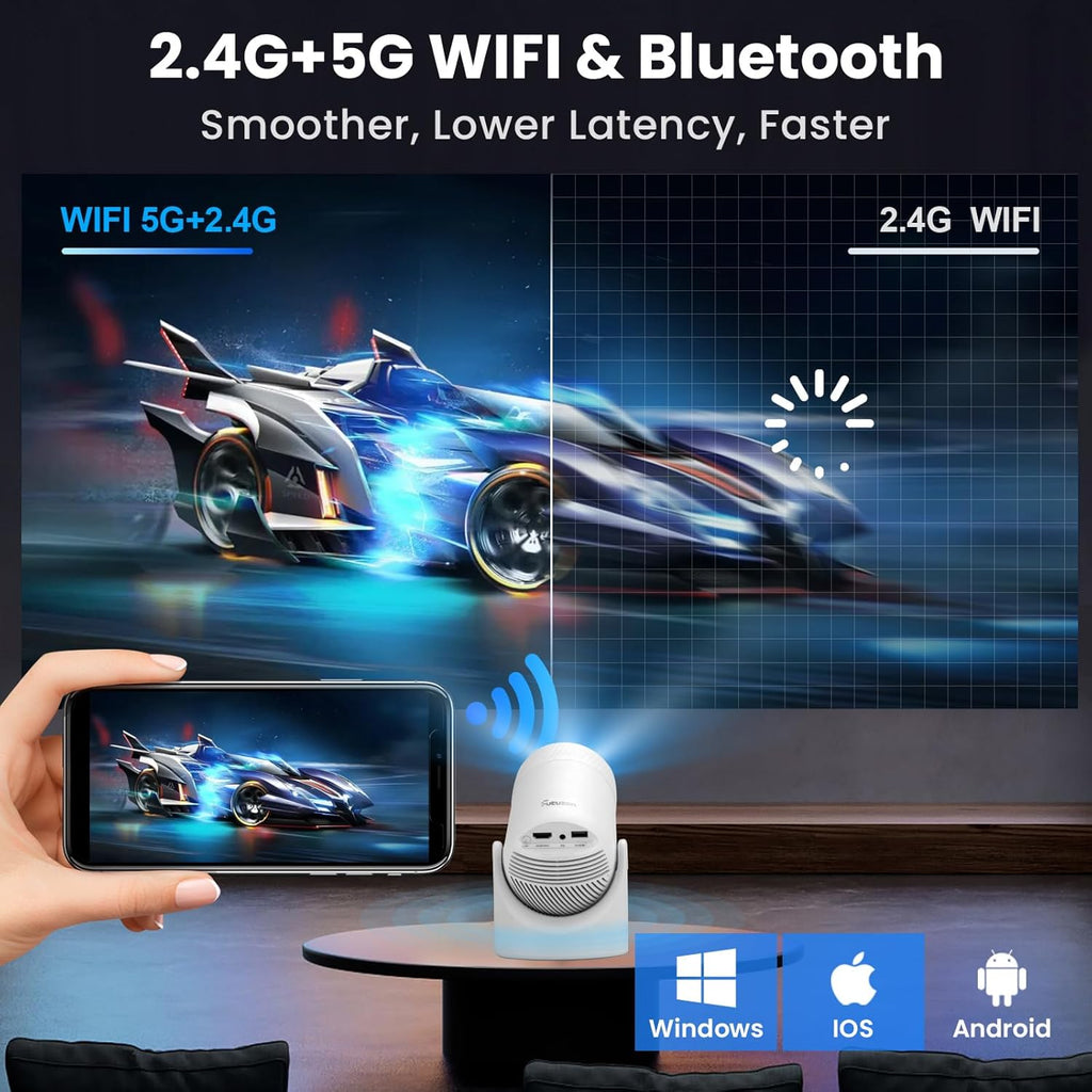 • 【Built-in Speaker|Bidirectional Bluetooth 5.0】More than a projector with wifi and bluetooth, it's an audio powerhouse! Transmit Audio Out: Send audio from this mini projector for iPhone to bluetooth speakers/headphones(great for backyard parties!).Receive Audio In: Play audio through the mini projector's speaker, works with AirPods, JBL and 99% of devices. A tv projector with wifi and bluetooth that easily adapts to your sound needs.*The Bluetooth function can only play audio, not video/images.